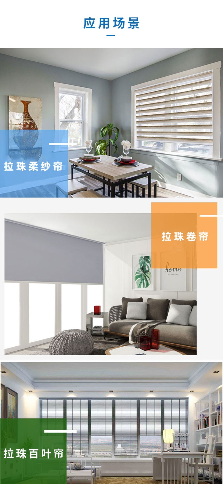 此產(chǎn)品適用于拉珠卷簾,可以把傳統(tǒng)的拉珠卷簾改變?yōu)橹悄茈妱哟昂?,安裝簡單,操作方便。安裝后可通過遙控器、語音、手機APP等控制窗簾升降。